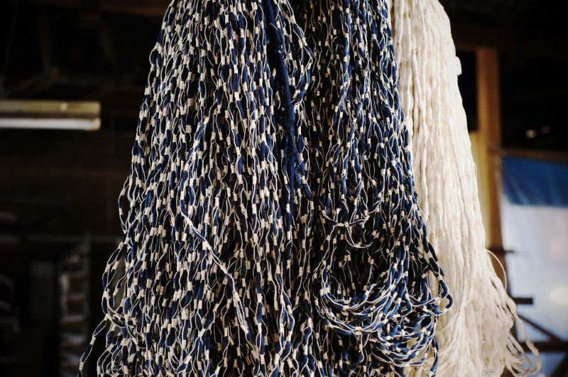 | 何十本も束ねた糸を、部分部分を糸でくくる。一見、無造作にくくられたような「かすり」の糸はこの状態でみてもきれい。この「くくる」という作業はかすりを織り上げる行程の中でも重要な作業。はじめに柄に合わせて「くくる」のだから、綿密な計算の上にこの作業は行われている。この「くくる」部分が防染となり藍色と白のコントラストのきれいなかすり糸となる。