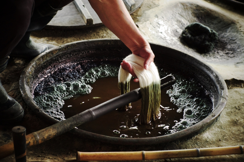 | 藍の原料の蓼藍(たであい)は、中国から日本に入ったのは室町時代。その後、長い年月をかけ全国に藍染めは広がり、1750年ごろには久留米でも盛んに藍染めされるようになる。明治に来日した外国の学者達からは「この日本は、神秘なブルーに満ちた国」と絶賛される程、日本に定着した。その藍染めは現在でも当時と変わることなく同じ手法の天然藍のみを発酵させ、かせ染めによる染色が久留米かすりの生命線とまでいわれている。