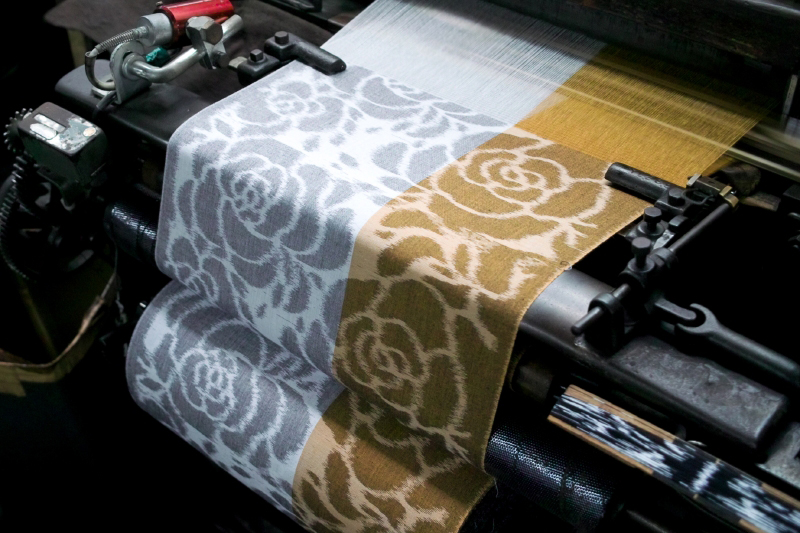 | かたん・ことんと日本昔話でも登場するような織機が久留米かすりの現場では現役なことは珍しくない。その昔は、各家々でおばあさんが・お母さんが家族の事を想いながら大切に織られたかすり。現在では機械での生産も多いが、糸一本一本を機にかけ、たて糸・よこ糸の柄をずれない微調整して大切に丁寧に織り上げる。交差するたて糸・よこ糸の重なりによって立体感が生まれ、かすり独特のかすれと共に風合い豊かな生地をつくり出す。